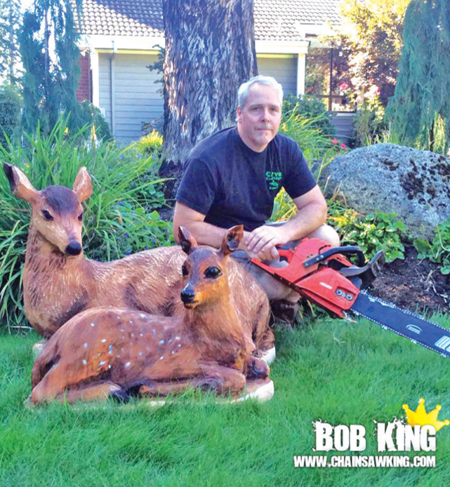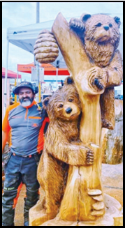 b started carving in the fall of 1998 after seeing a local carver at the fair. He worked at Boeing and carved on the side until he was laid off in 2000, which prompted his move into full-time carving. He is now the owner of Bear Necessities Sculpture, LLC where he keeps busy filling orders for both private and corporate customers. King entered his first competition after carving only three bears and has been competing ever since. Bob was one of the original members of the Echo-USA Carving Team; having been asked to join in 2005. King is the main carver for Burton Snowboards, handling there custom jumps for snowboard runs. He has traveled to Daytona for Bike Week, carved at the Pocono 500 in Pennsylvania, Participated in Harley Davidson’s 105th anniversary celebration in Milwaukee, Wisconsin and worked in conjunction with Lucas Films and Disney.In 2010, Bob was honored with a star in the Carvers Walk of Fame in Mulda, Germany for winning more competitions then anyone in the world! Bob was honored with a fourth-place award for Best Overall Carver in the 2014 Loggerodeo™ carving competition. His winning carving was then purchased by Loggerodeo™ and donated as a memorial to the town of Oso WA. for the mudslide. With the help of Patricia Dwelley of Reedsport, King created the Oregon Divisional Chainsaw Sculpture Championships in 2000. he has been invited to represent the United States in competitions in Germany, England, Scotland, Denmark, Holland, and Canada. He lives in Edgewood, Washington and carves all around the United States while not at home or traveling abroad. You can follow his travels on both his Website and Facebook page. More or less a self-taught carve, Bob continues to grow in this art from by learing from other artists and pushing himself to try new things. Bob carves anything form realistic wildlife sculptures to scenes form life as he see them. Every year brings new adventures in wood sculpture and connecting with friends and family along the way.