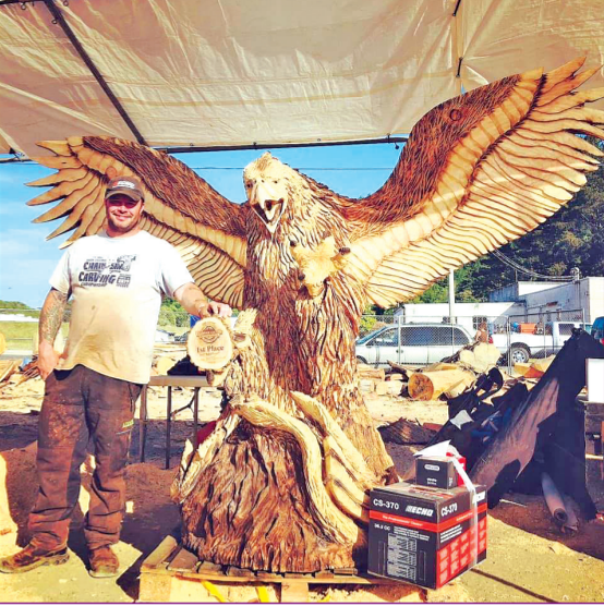 Growing up in Reedsport, Oregon, Ryan displayed artistic abilities. He was introduced to chainsaw carving just shortly after turning 16 and became hooked on the art. Today he is a pro chainsaw sculptor, pumpkin sculptor, a member of the Makita carving team USA, and the Food Network’s Season 2 Outrageous Pumpkins champion. Ryan started his chainsaw carving career in June of 2005 after being apprenticed by Tracie Brittenfield of Packwood, Washington. After graduating from Reedsport High School in 2007, Ryan began carving full time and attending more competitions. Ryan worked under Mark Colp during the winters of 2007 through 2011 learning more of the trade, which was hugely beneficial to Ryan’s sculpting career.
