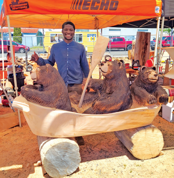 Raised on a farm in Ohio, Anthony builds luxury homes for a living. He moved to Hoquiam, Washington where he came across a large piece of driftwood and felt the urge to carve it into a wolf. He bought a chainsaw and ….BOOM! He found his passion and has been chainsaw carving ever since. His infectious enthusiasm graces homes and businesses all over Washington and throughout the United States. He is the proud owner of Native Beach Accessories on Ocean Beach Road in Hoquiam, where his incredible talent is showcased.Anthony was severely injured in July, 2022 while disposing of fireworks. He lost most of his left thumb and some of his index and middle finger and was airlifted to Harborview hospital in Seattle for surgery. Not even a full year later he has overcome and is back to chainsaw carving. Anthony says, “You need three things to be an artist: gift, ambition, and desire.” Anthony, you are an inspiration to all of us!